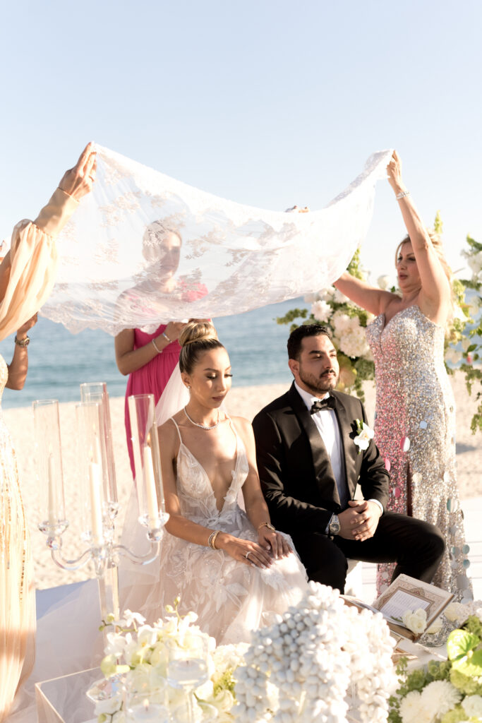 Pieces often arrive with their own history already attached. An embroidered handkerchief. Arras exchanged during the ceremony. A Kiddush cup. A chuppah canopy held overhead. A maang tikka, a Polki or heirloom diamond necklace, ceremonial garlands, family jewelry layered in with intention.
